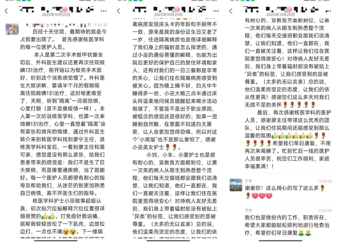 近日,患者王女士(化名)在广西科技大学第二附属医院(广西柳州肿瘤医院)进行了甲状腺全切手术,术后转入核医学科进行碘-131治疗,在王女士结束10天隔离,出院之际,专门向我院核医学科全体医护人员表达了深切谢意,为这段特殊治疗期间画上了温暖的句点。